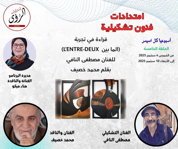 [ امتدادات فنون تشكيلية ] برنامج ثقافي فني تترافق فيه الإبداعات لتولد من رحم التحدي يتجدد أسبوعيا كل خميس إعداد وإدارة الفنانة التشكيلية المتعددة هناء ميكو Hanae Mikou ــــــــــــــــــــــــــــــــــــــــــــــــــــــــ الحلقة الخامسة من الخميس 4 سبتمبر 2025 إلى الأربعاء 10 سبتمبر 2025 ــــــــــــــــــــــــــــــــــــــــــــــــــــــــ قراءة في تجربة (الما بين L’entre-deux) للفنان مصطفى النافي بقلم محمد خصيف ــــــــــــــــــــــــــــــــــــــــــــــــــــــــ …
